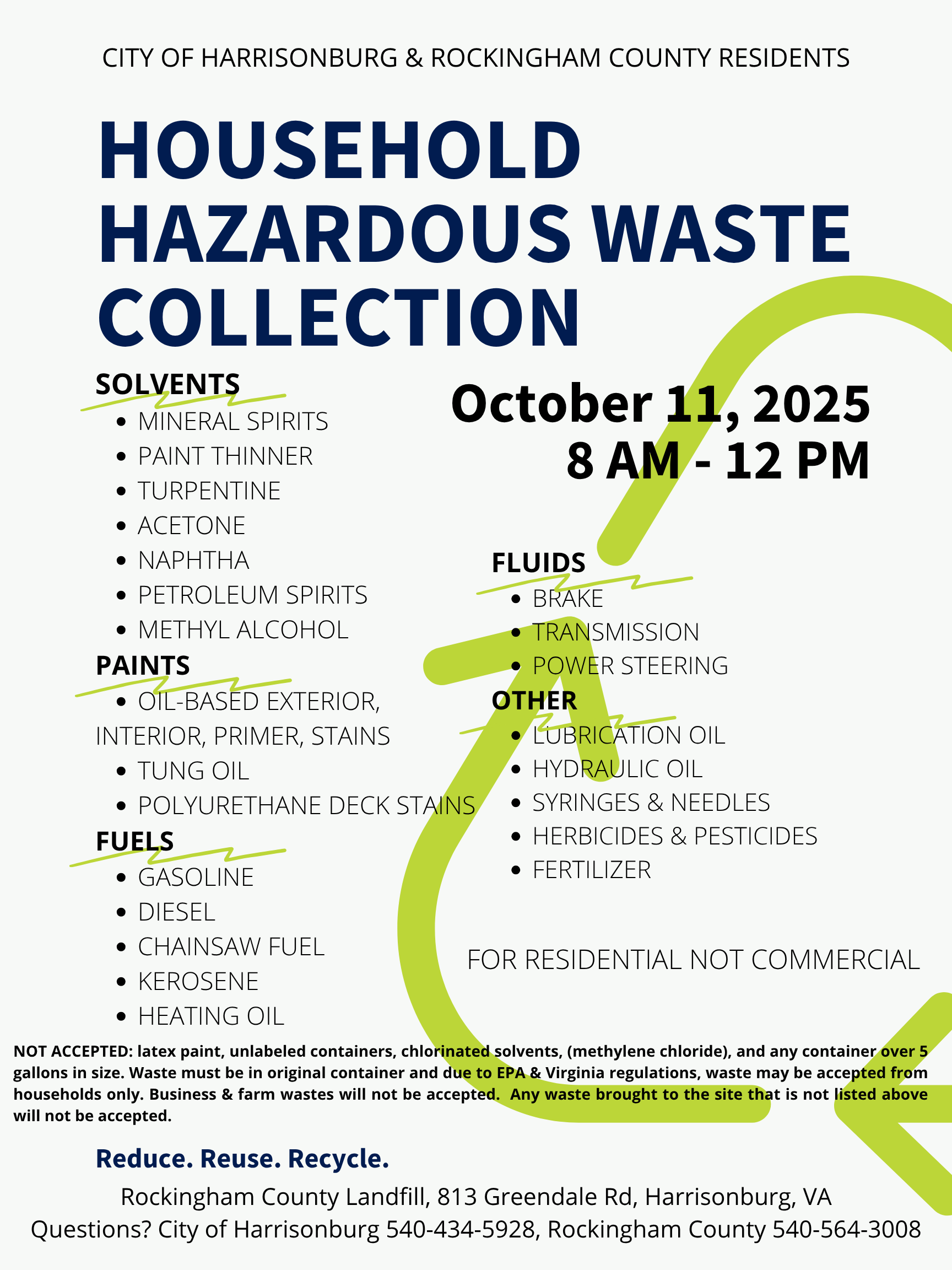 Household Hazardous Waste Collection to be held October 11, 2025, 8 AM - 12PM at the Rockingham County Landfill